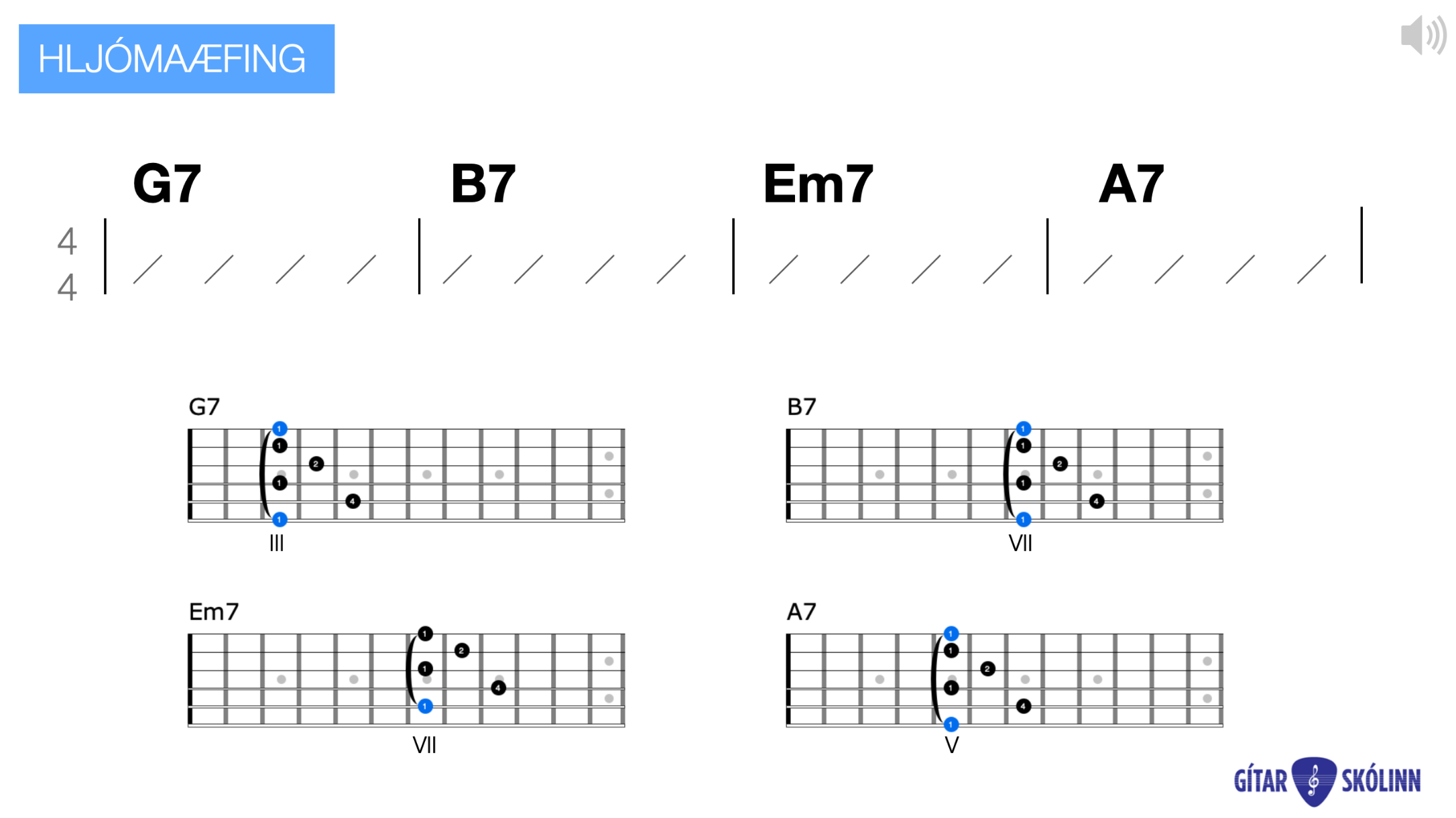 Æfing vikunnar er afmörkuð æfing sem hjálpar þér að halda þér reglulega við í spilamennskunni. Hún er hugsuð sem einföld og markviss leið til að styrkja ákveðinn þátt – til dæmis hljómaskipti, takt, hlustun eða flæði – án þess að það verði yfirþyrmandi. Þú þarft ekki að ná þessu fullkomlega; markmiðið er að vinna rólega með æfinguna nokkrar mínútur í senn og leyfa henni að setjast í fingur og líkama. Regluleg, stutt vinna skilar meiri árangri en ein löng æfing af og til.